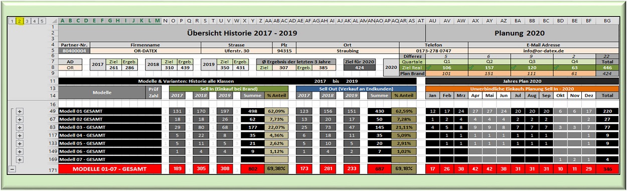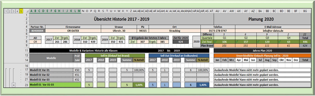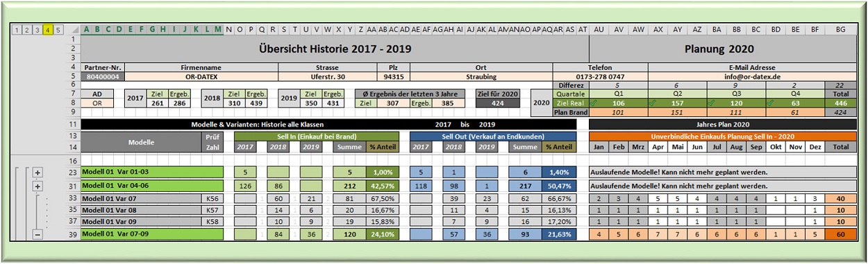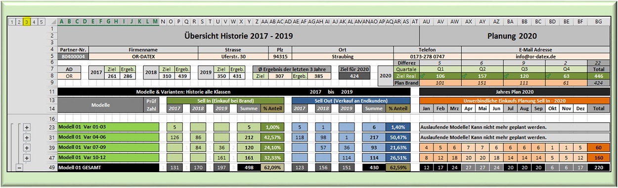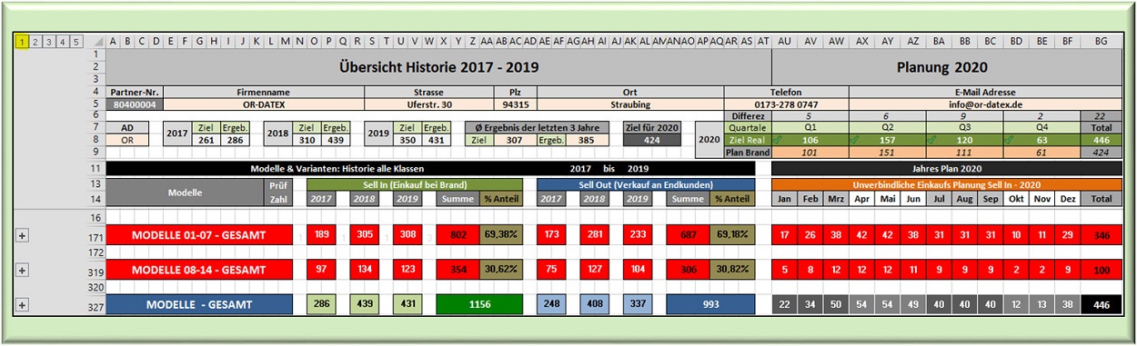 der rechte Block die zu planenden Jahreszahlen. Angezeigt werden im rechten Block nur die Gesamtsummen. Einzelne Modelle monatlich, in Quartale